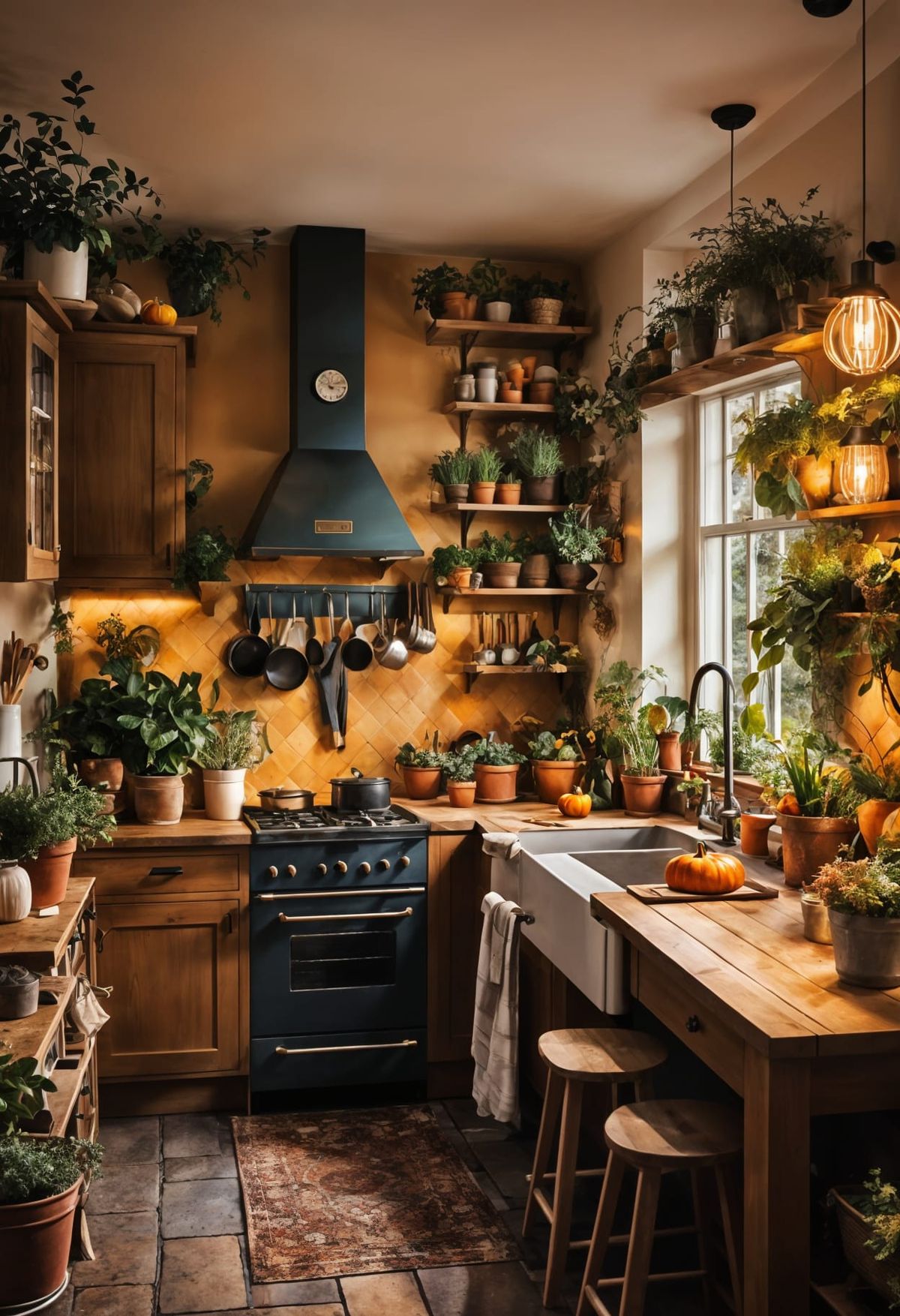 This image depicts a warm and inviting autumn kitchen scene, filled with an abundance of thriving houseplants, creating a cozy and natural atmosphere.