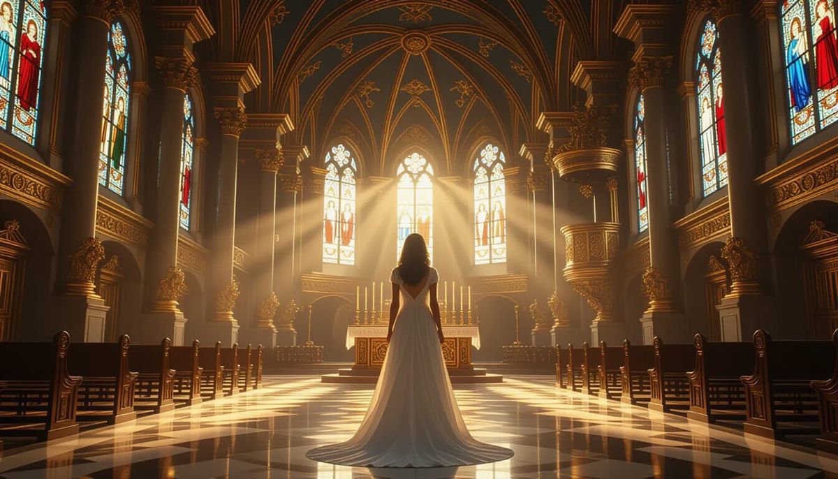 This image showcases a majestic baroque church interior illuminated by golden dawn light. A woman stands at the altar, highlighting intricate architecture and a serene atmosphere in photorealistic detail.