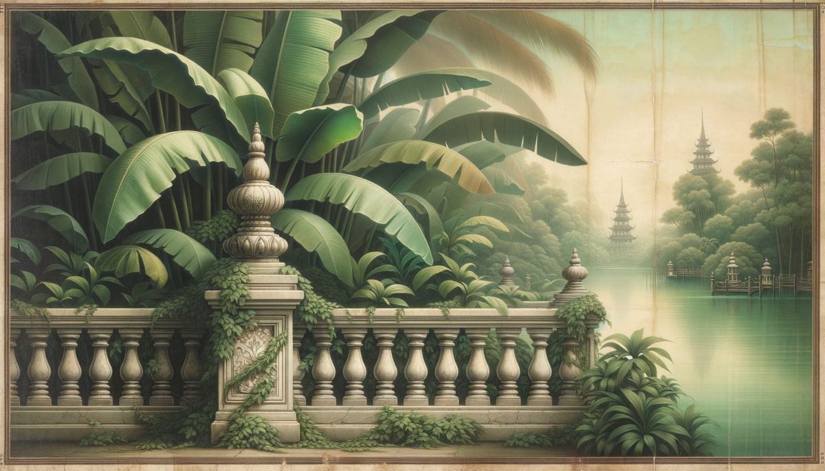 This image shows a fragment of vintage wallpaper with a tropical garden scene. A white stone balustrade with trailing vines sits before lush banana leaves and palms, with a distant pagoda visible across a lake.