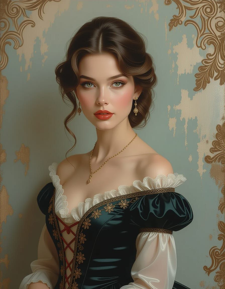 A striking picture of a woman's portrait with dynamic lighting and elegant attire. The image has a cinematic aesthetic, noticeable film grain and a subtle vignette, with post-processing that evokes a hyper-realistic 8k resolution.