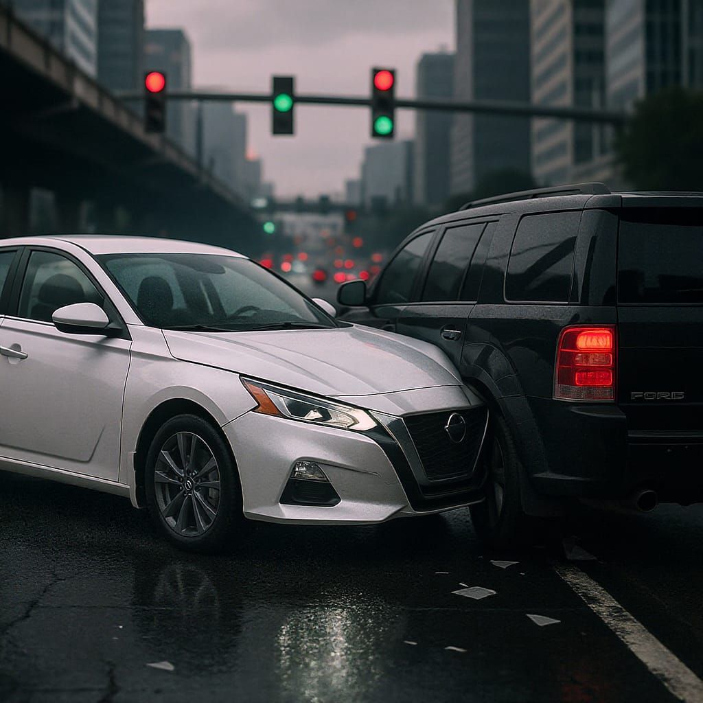 This image shows a car accident at a stop light between a white Nissan Altima and a black Ford Flex. The cinematic scene blends photorealistic and futuristic elements in a retro-futuristic aesthetic.