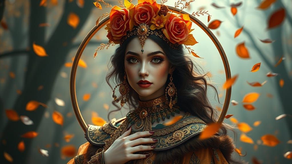 This enchanting image captures a mystical autumn goddess amidst a whirlwind of falling leaves, set against a vibrant enchanted forest backdrop. Her delicate face paint, intricate golden jewelry, and ornate costume shimmer in the soft, cinematic lighting, evoking a sense of depth and dimensionality remini...