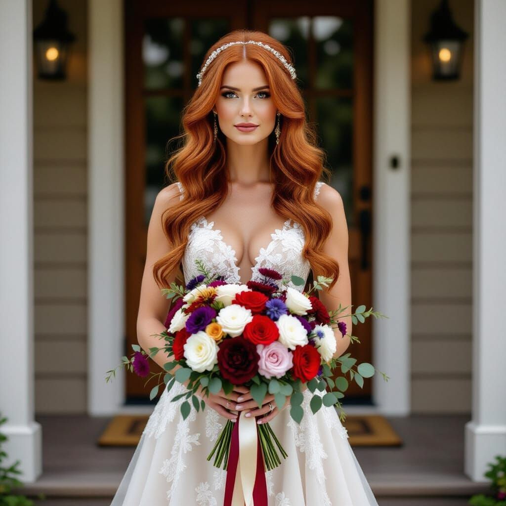 This image shows a full-length portrait of a European woman with long red hair, standing outside a house. She is wearing an elegant wedding gown and holding a colorful bouquet, creating a romantic, ethereal image.