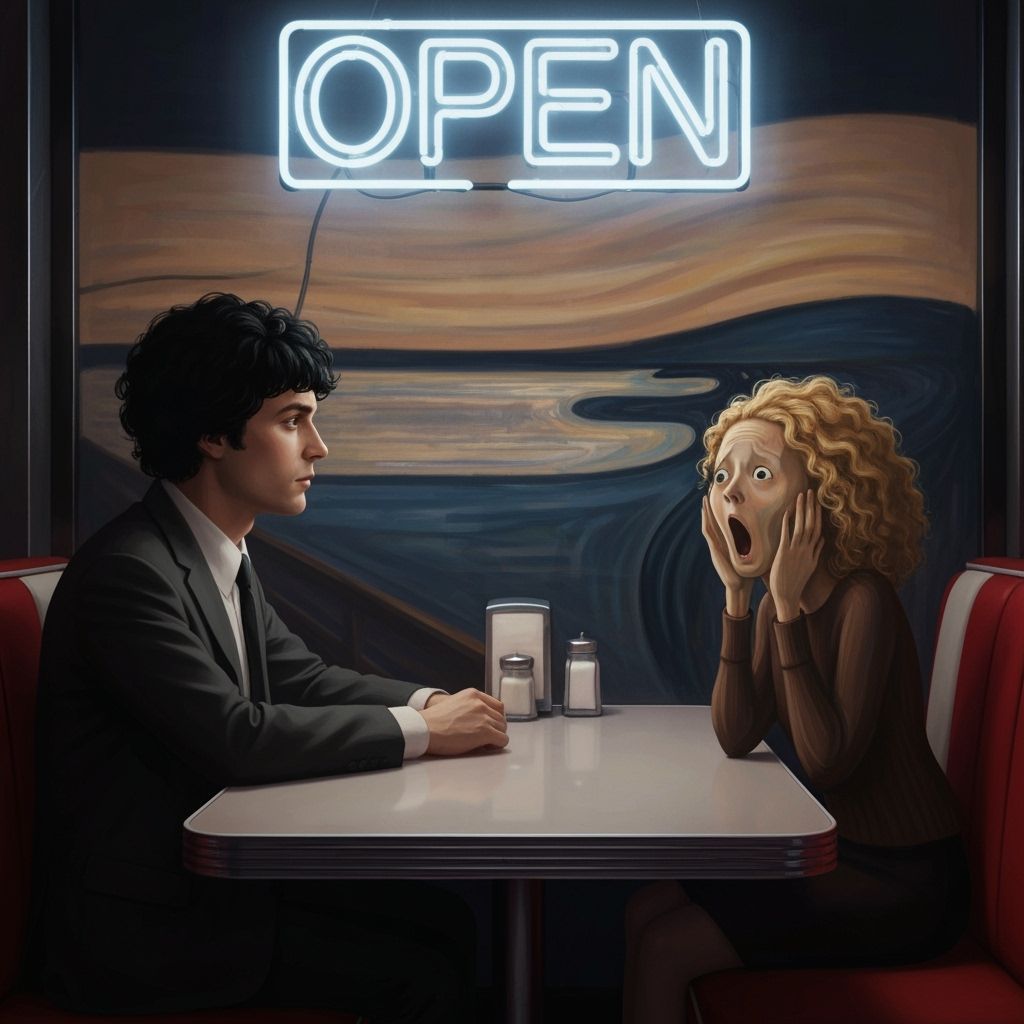 A surreal scene in a vintage diner where a man sits opposite the iconic screaming figure, reimagined with blonde hair. Dramatic neon lighting and bold colors create a cinematic atmosphere.