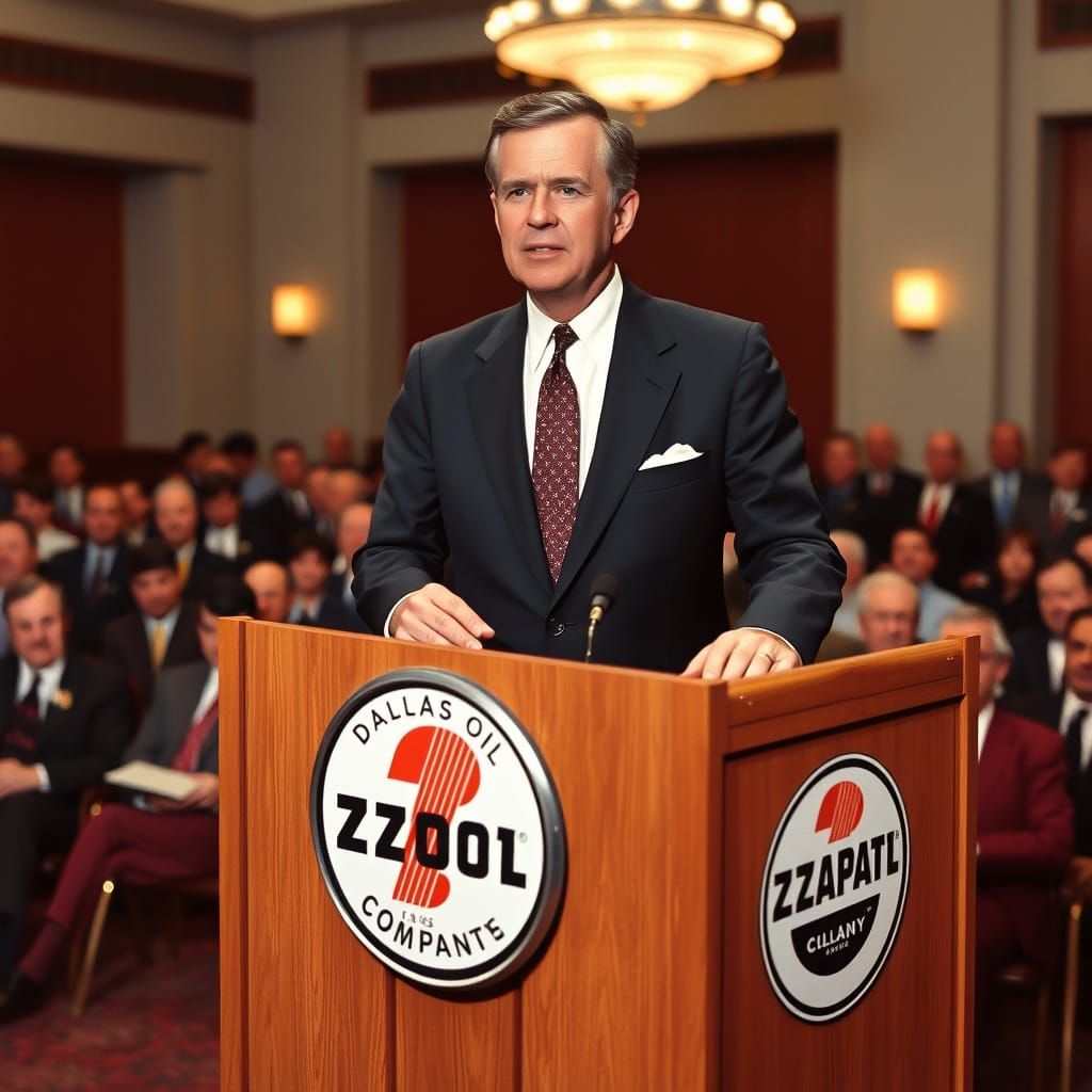 This image shows George Bush Sr. in a 1960s suit at a Zapata Oil Company meeting in Dallas, Texas. The retro aesthetic evokes the styles of pop art and realism.