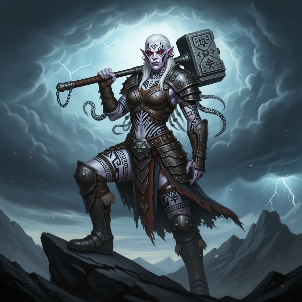 This image shows a powerful albino orc warrior atop a mountain, ready for battle. The scene features a dramatic storm, with dynamic lighting and a rich, deep color palette.