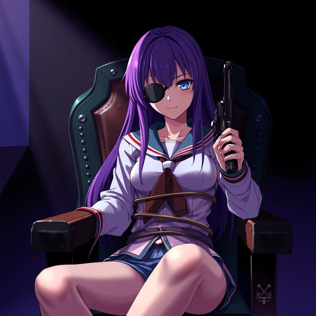A striking image of an anime hero, tied and helpless, surrounded by dark shadows, as a striking anime girl with purple hair and a menacing smile exerts control, set in a futuristic world with vibrant colors and intricate details.