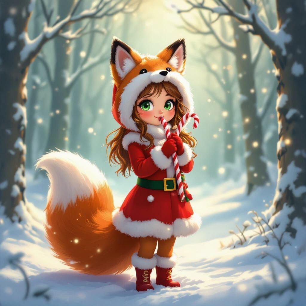 This whimsical illustration depicts a person in a festive red and green fox costume holding a candy cane in a snowy forest, rendered in a soft, storybook style with enchanting light.