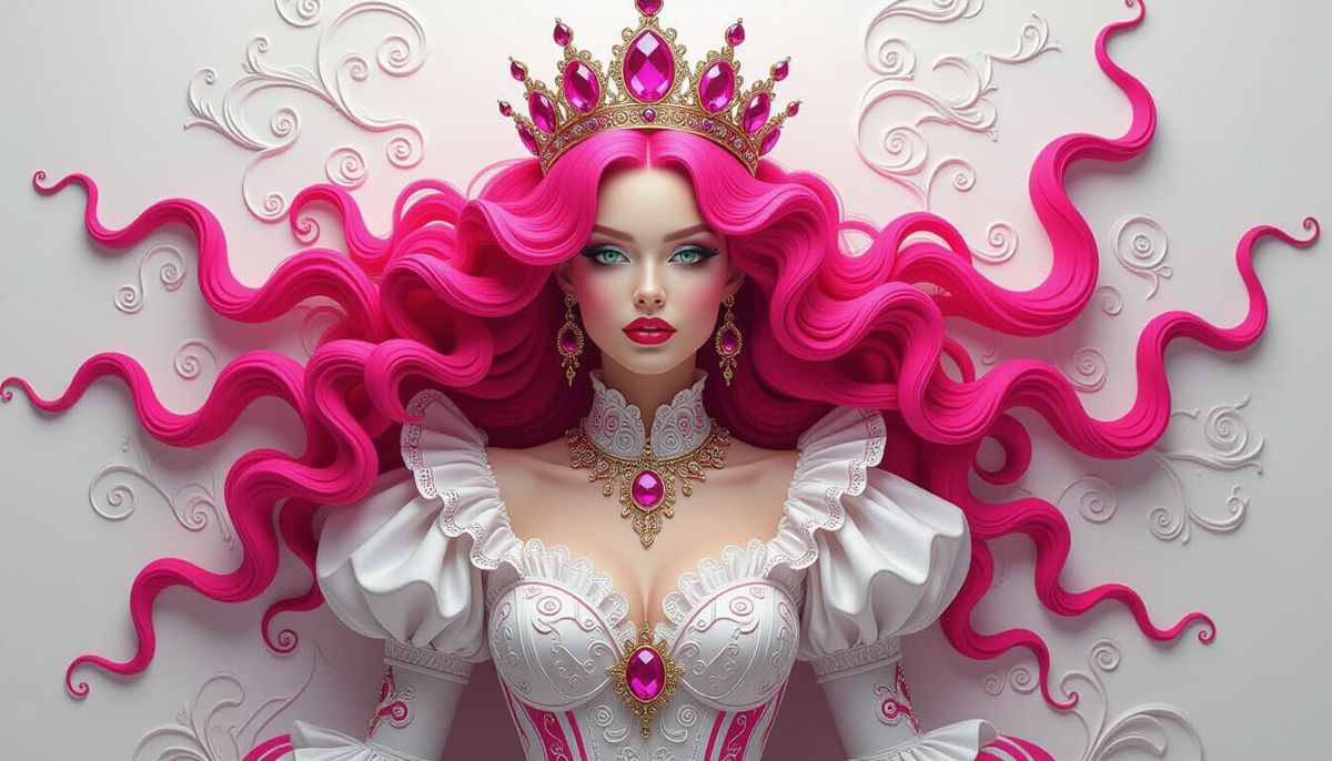 This image features a regal Steampunk Queen with vibrant neon pink hair and crown, dressed in a detailed pink and white outfit. Rendered as a surreal abstract vector fractal with a melting oil effect.