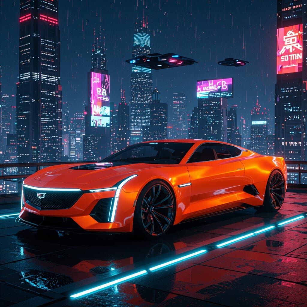 This image shows a futuristic Cadillac concept car parked on a platform. The vehicle is Day-Glo orange and overlooks a neon-lit cyberpunk city with skyscrapers and flying vehicles, rendered with vibrant, high-contrast colors.