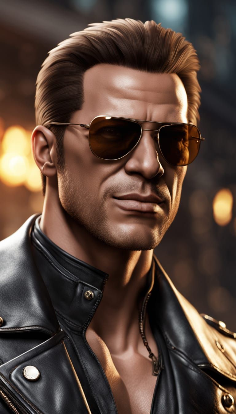 Unreal Engine. Close-up portrait. Johnny Cage smirking with signature attitude. Pushes his aviators up with his middle finger. Eyes visible just above the frame, locking with the camera in a sarcastic glare. Hyper-realistic digital art. Iconic Hollywood swagger. Subtle stubble, perfect lighting on chiseled jawline. Golden aviator lenses gleaming. Leather jacket reflecting moody directional lighting. High-contrast, cinematic depth. Stylized irreverence. Bold color palette. Razor-sharp textures. 8K resolution. Masterpiece. Best quality.