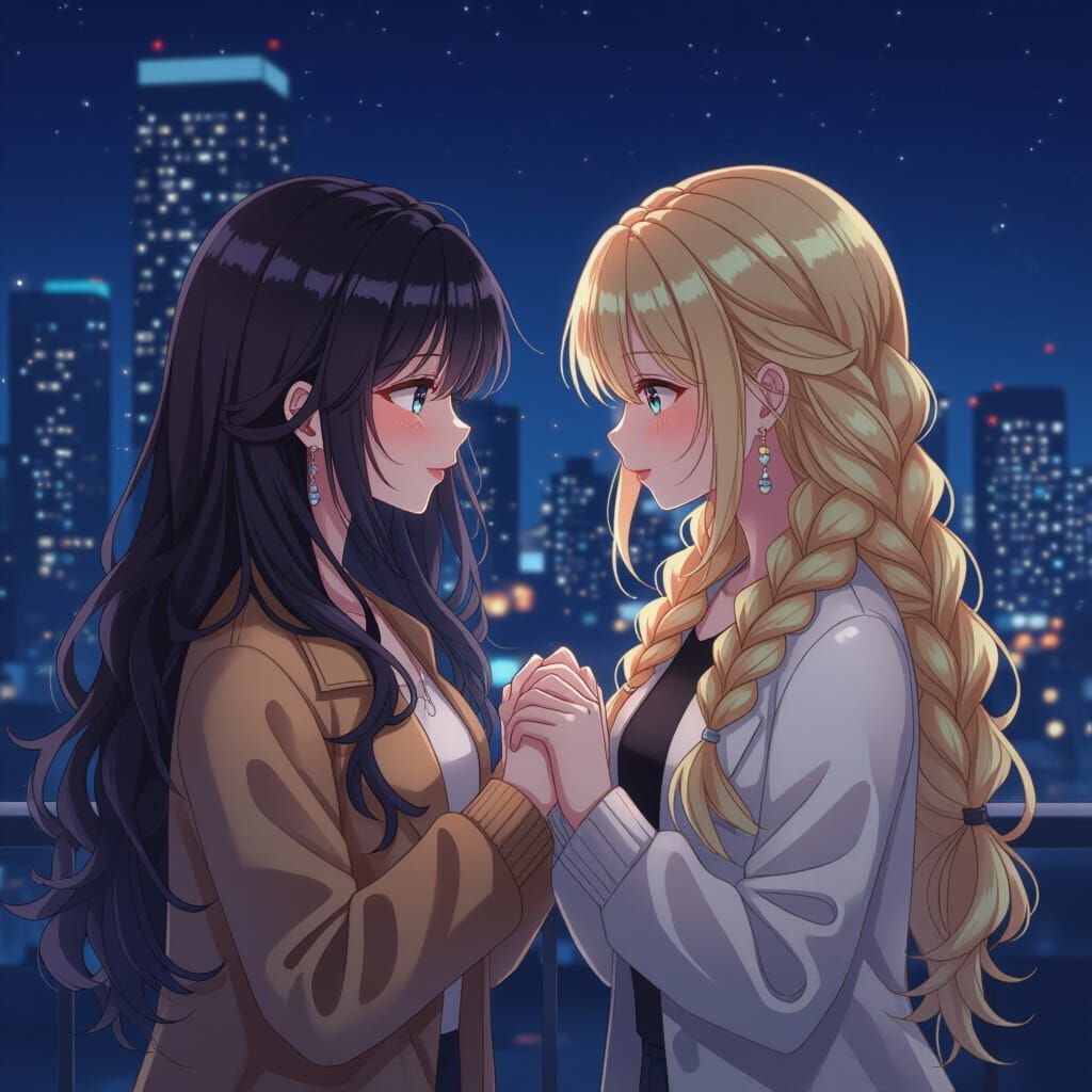 This image shows two young women, one with black wavy hair and the other with blonde braided ringlets, holding hands and blushing in a city at night, rendered in an anime manga wallpaper aesthetic.