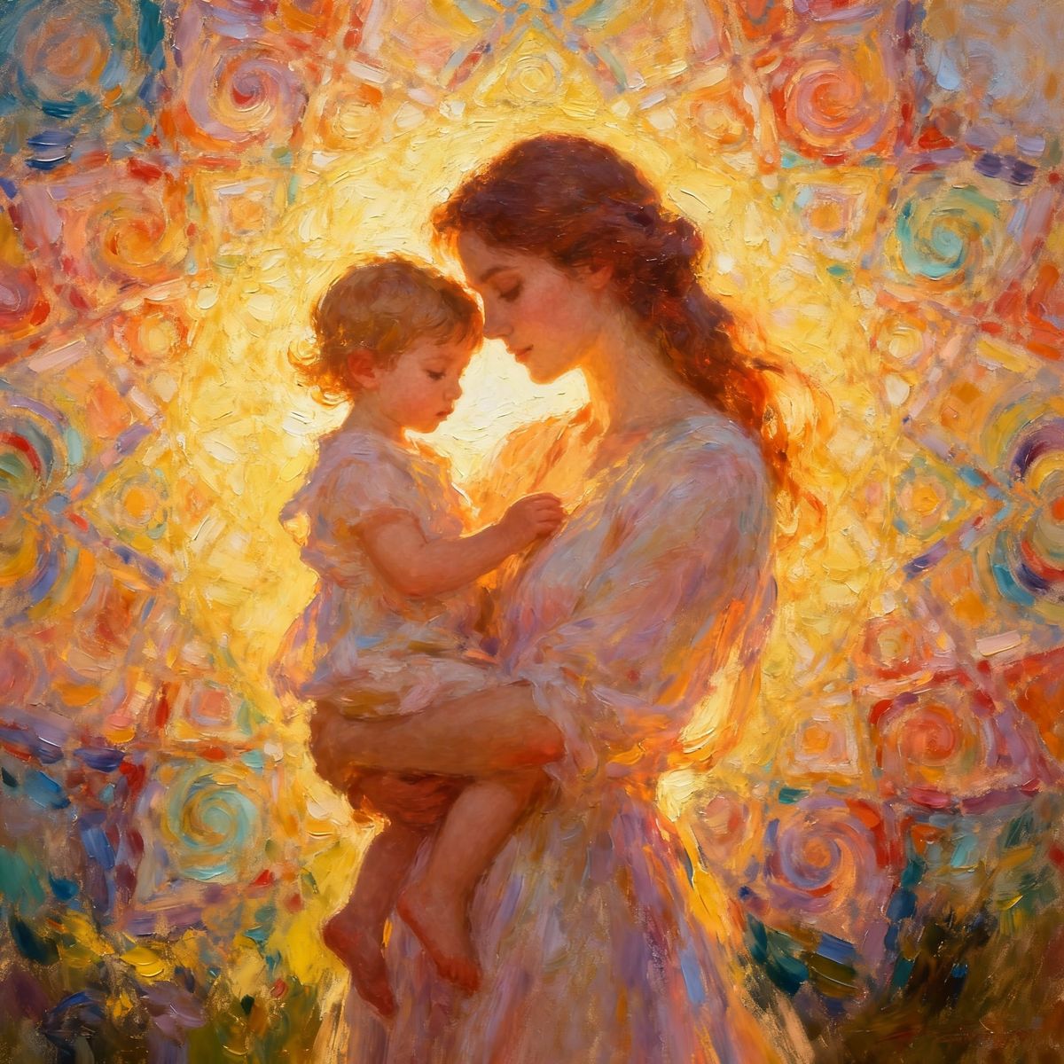 This image shows a tender moment between a mother and child, bathed in golden hour light. The scene is depicted in a soft, atmospheric oil painting style with a vibrant, swirling colorful backdrop.