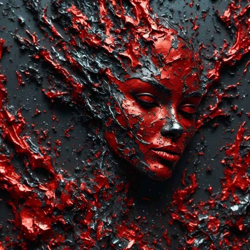 This image showcases a complex blend of artistic styles, featuring deep and neon red gradients. The artwork incorporates elements of cybernetics, abstraction, and various painting techniques.
