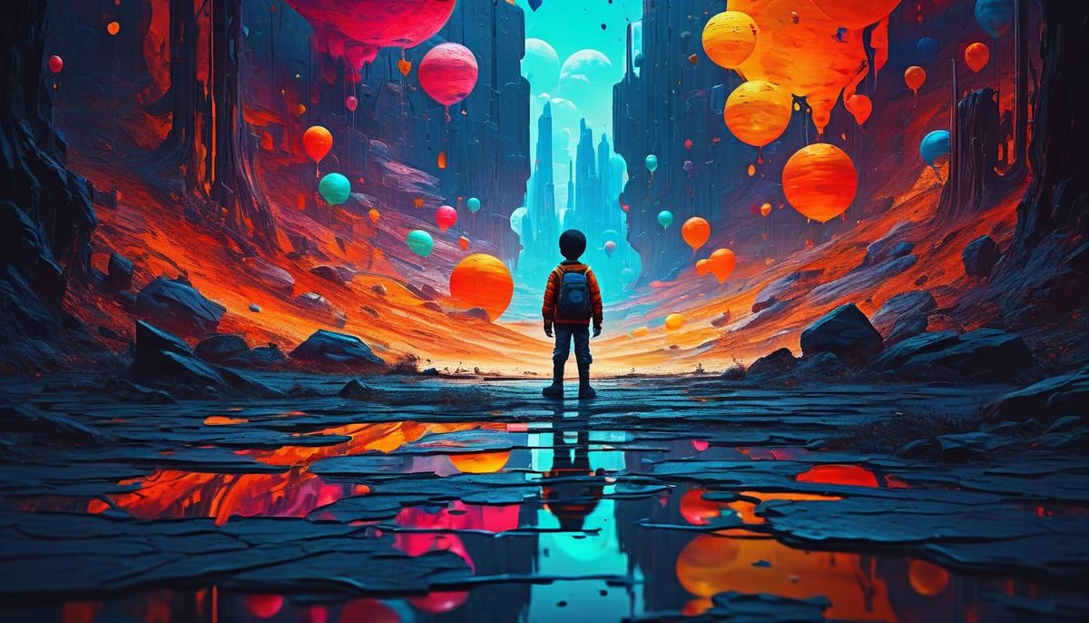 A striking oil painting of a child in a surreal patchwork world. The artwork features vibrant brushstrokes, glowing colors, high contrast lighting, and whimsical, sci-fi details. Rendered in 8k resolution.