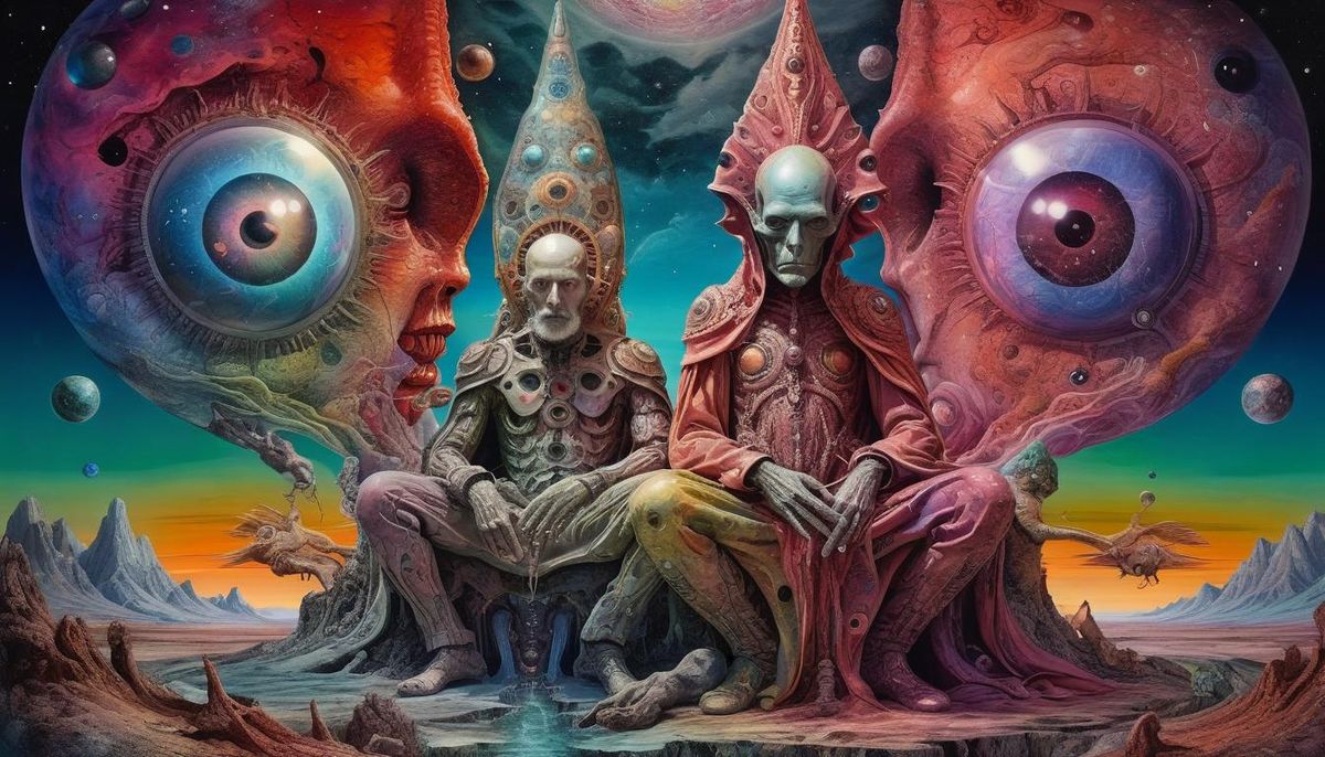 A visionary mixed media artwork in imperial colors. This image captures a cinematic feel with sharp focus, reminiscent of psychedelic art.