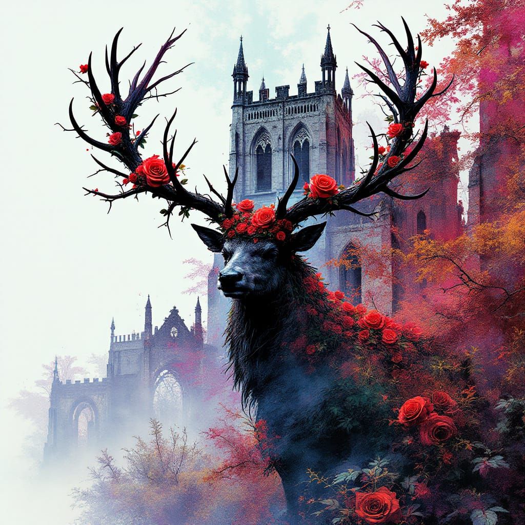 A majestic stag, its antlers entwined with thorny roses, stands defiantly against a backdrop of a crumbling gothic cathedral. The scene is rendered in a double exposure style, merging the animal's silhouette with the ancient architecture. Psychedelic surrealism elements twist the colors into vibrant, ...