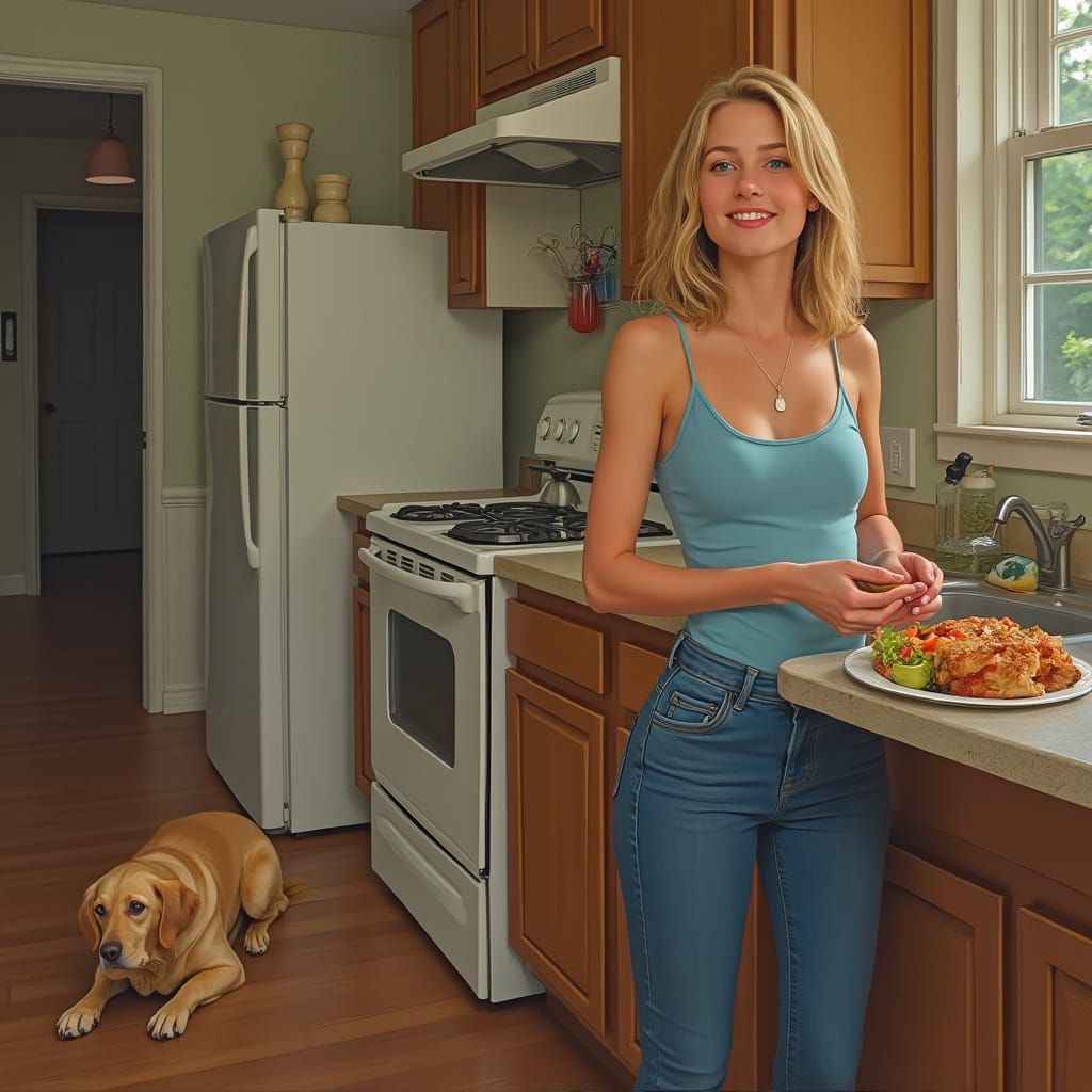 This image shows a realistic portrait of a pretty teenager with sandy hair in her kitchen. The artwork captures everyday life with photorealistic detail and soft, warm lighting.
