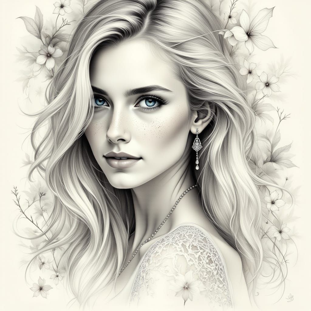This image features a stunning woman with long blonde hair and blue-green eyes, depicted in a romantic, enigmatic style. The setting is a dappled summer woodland.