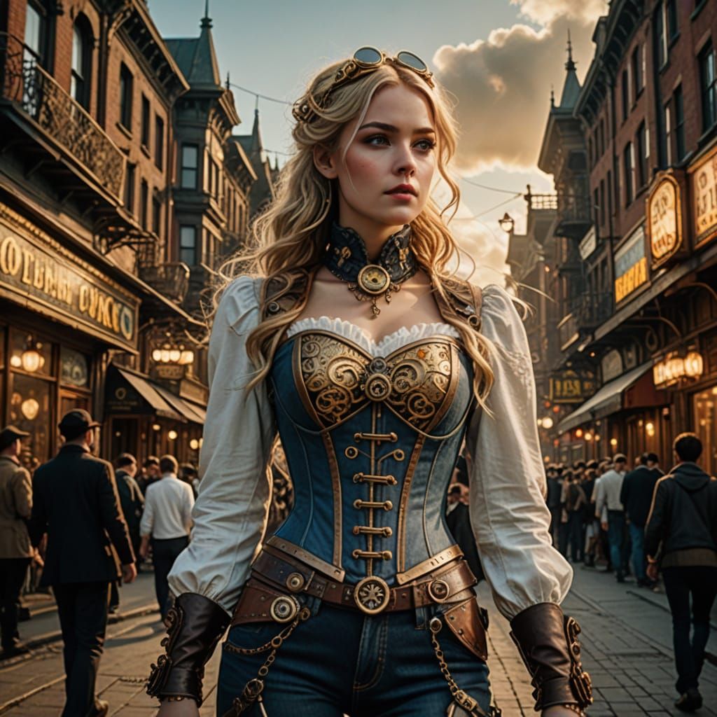 A hyperrealistic, highly detailed illustration of a woman in a white and gold corset and bell-bottom jeans, set in a bustling Victorian square with zeppelins overhead. Captured in golden hour lighting.