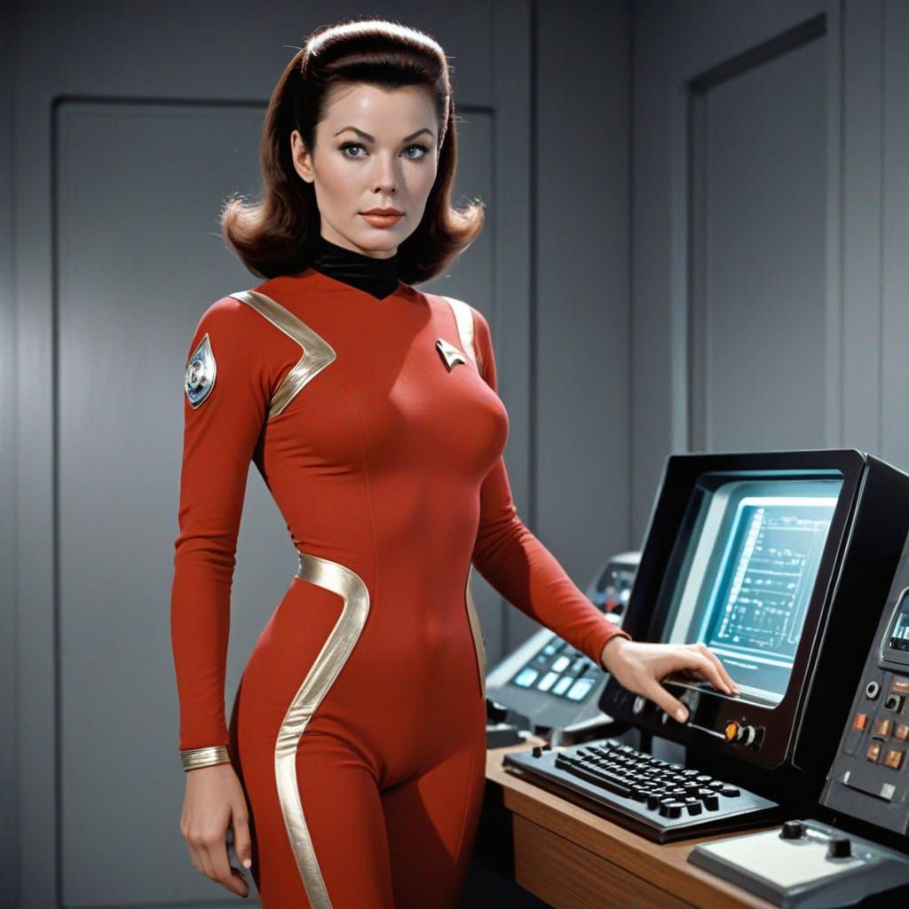 A retro science fiction image displays a bare-chested space woman in a vintage Star Trek style. The artwork evokes classic science fiction aesthetics.