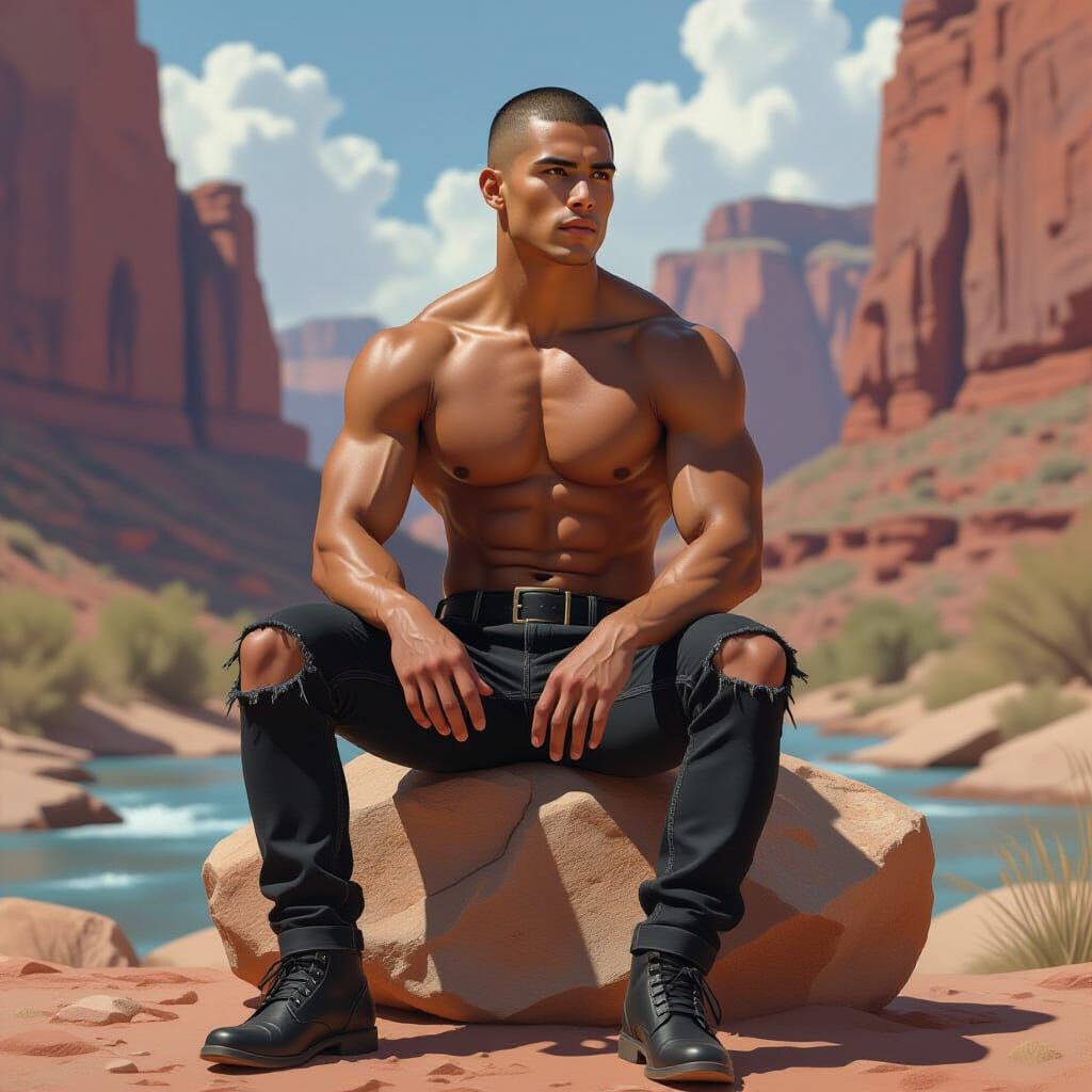 This image shows a young, athletic Latino man with a toned physique and pensive gaze, sitting on a stone against a backdrop of red cliffs and a river, rendered in a gritty, hyperrealistic concept art style with dramatic lighting.