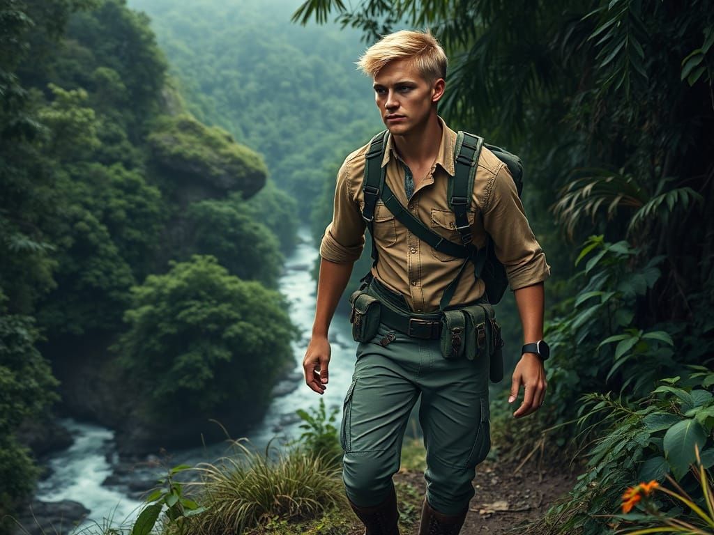 This image depicts a light-skinned, fit man trekking through a lush jungle landscape. He wears practical hiking gear and the scene is rendered with dramatic lighting and atmospheric depth, in a digital matte painting style.