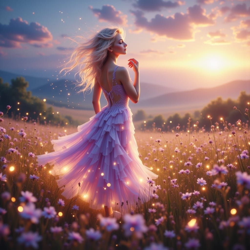 This image captures a beautiful woman in an enchanted meadow under a pastel twilight sky. Fireflies and petals create a magical, serene atmosphere with soft, warm lighting.
