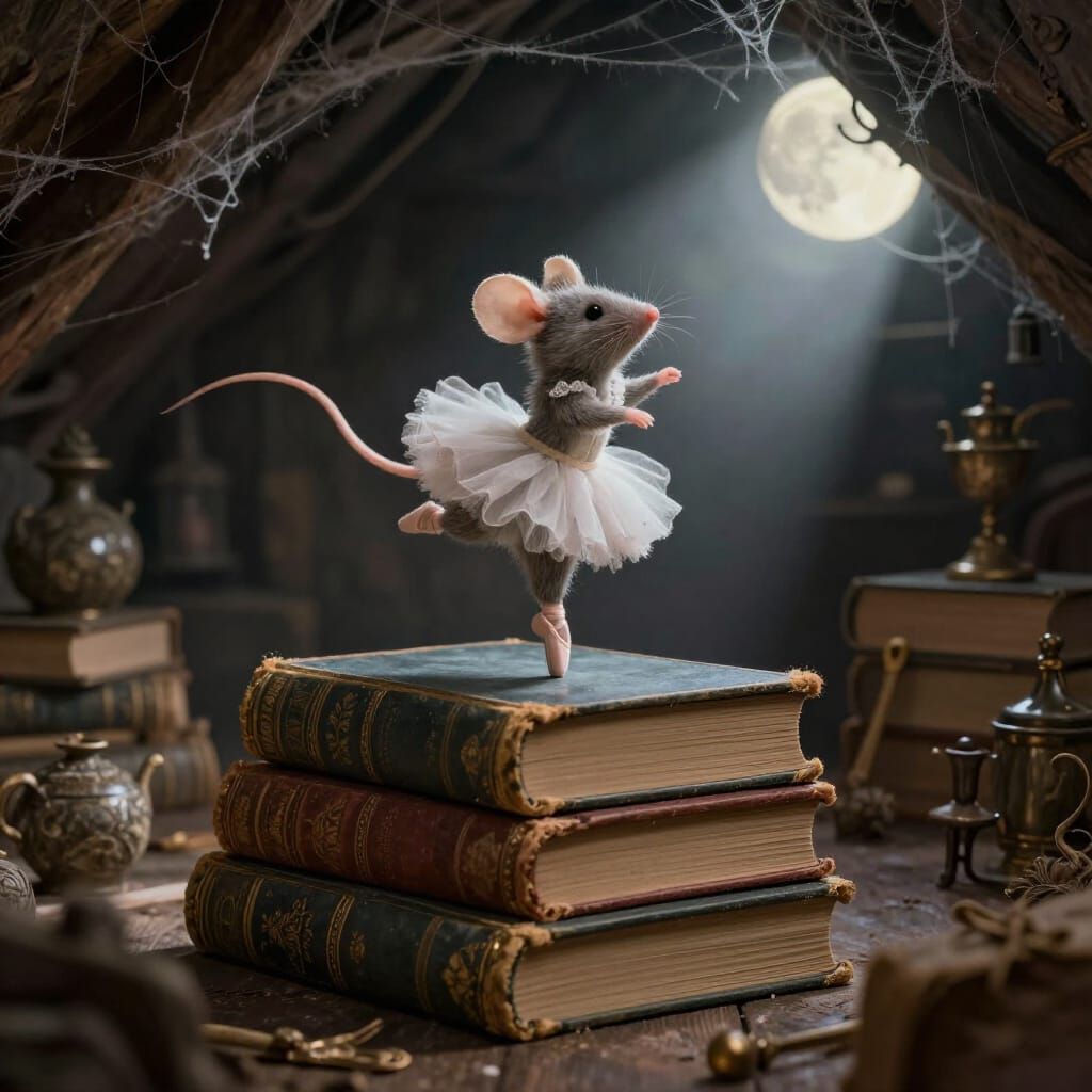 This image shows a charming ballerina mouse dancing atop old books in a moonlit, forgotten attic. The artwork has a naive, dreamlike style with soft painterly textures.