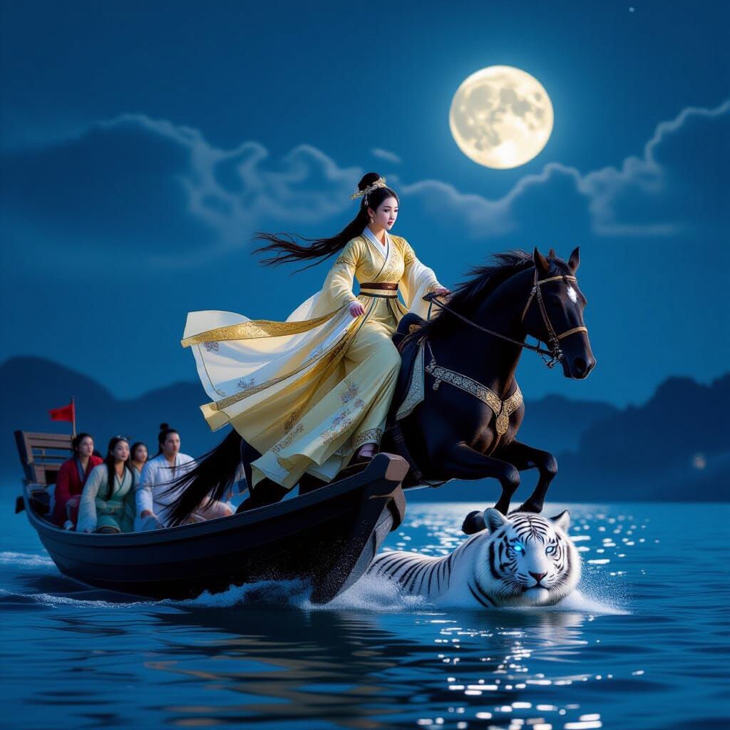 This image shows a girl in a golden hanfu dress riding a black horse leaping over a boat filled with astonished people. A blue-eyed white tiger follows them in the moonlight.