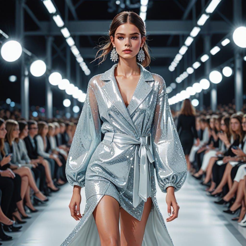 This image showcases a beautiful girl modeling on a catwalk in a stunning full shot. Created in a vibrant digital art style, the scene is filled with bright runway lights, pastel colors, and elegant details.