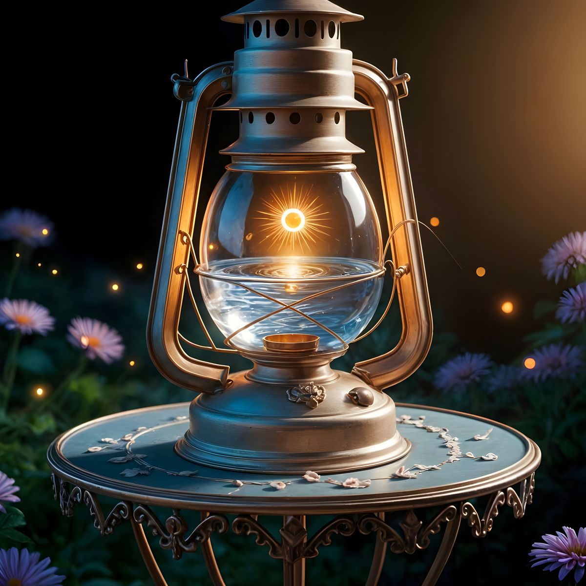 This image shows a glowing lantern illuminating a serene night garden. Inside, a miniature world thrives with a radiant sun and crystal water, creating a surreal, dreamlike atmosphere.