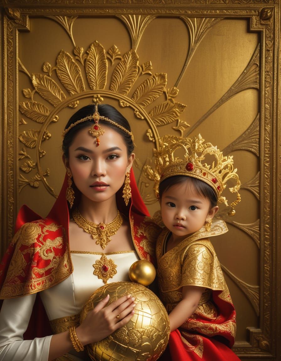 This stunning portrait showcases a regal Southeast Asian woman in a stunning white gown with intricate gold tribal patterns and a golden tiara, surrounded by opulent Baroque ornaments and cinematic lighting.