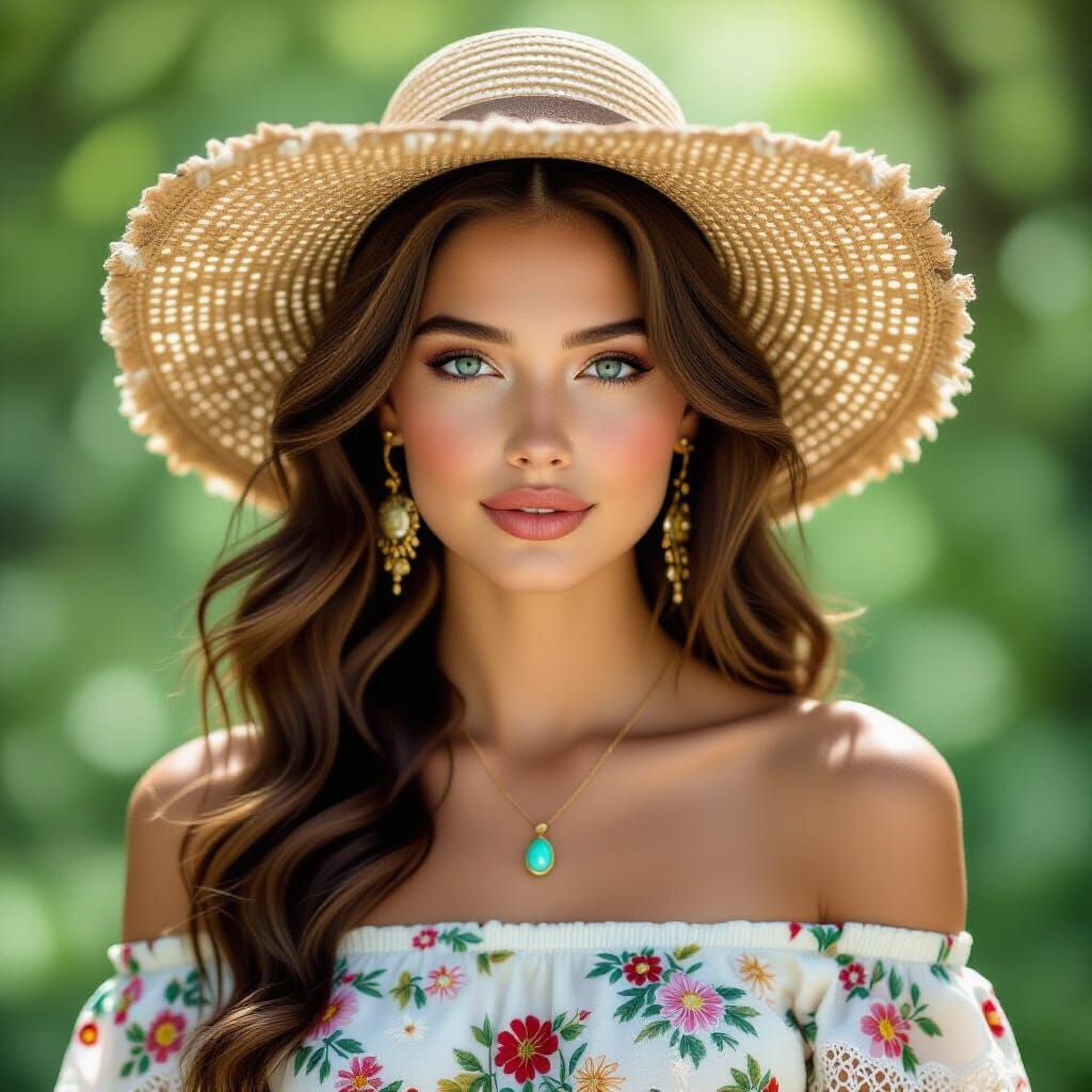 A serene portrait of a young woman with long brown hair and striking blue eyes in a sun-dappled forest. She wears a straw hat and floral dress in an Art Nouveau style.