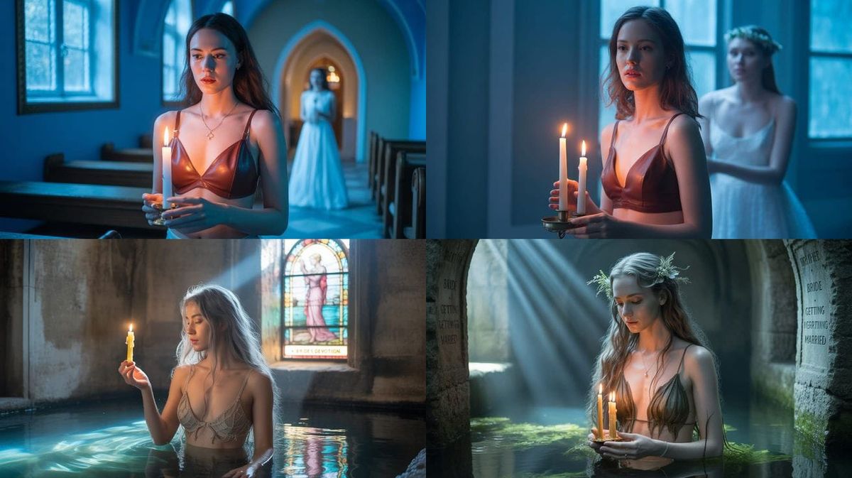 This image shows an ethereal woman in an underwater scene, wearing a leather bralette and holding a candle. It evokes a surreal, dreamlike aesthetic within an aquatic setting.