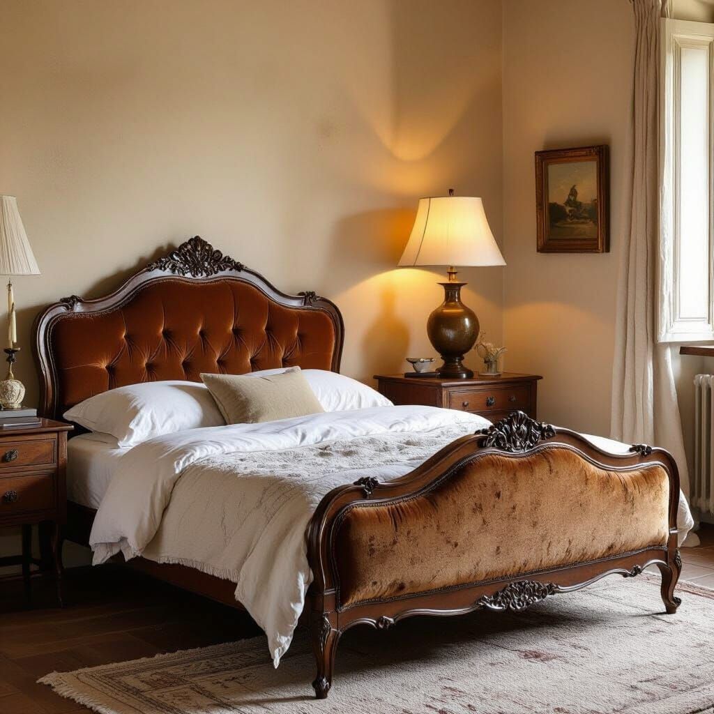 This image shows a vintage bed with a velvet headboard and an ornate wooden frame, accompanied by a rustic bronze lamp with a cream shade. The picture evokes a warm, nostalgic atmosphere.