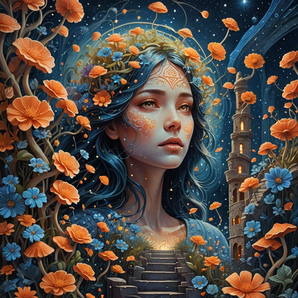 A surreal image of a woman's face merging with staircases and flowers under a starry sky. Bioluminescent mushrooms and constellations add to the dreamy, mystical digital art.