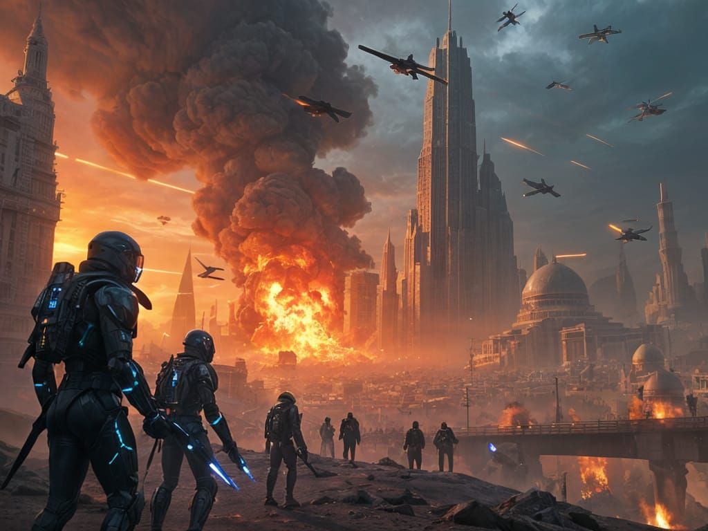 This image shows a futuristic city under attack, with advanced soldiers and drones clashing amidst fiery explosions. The scene is rendered with a cinematic color palette and intricate architectural details.