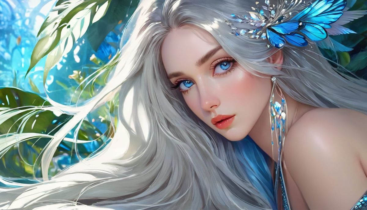 A captivating anime muse poses on a chaise lounge within a futuristic botanical garden. This mid shot captures her allure with long silver hair and delicate features in a watercolor style.