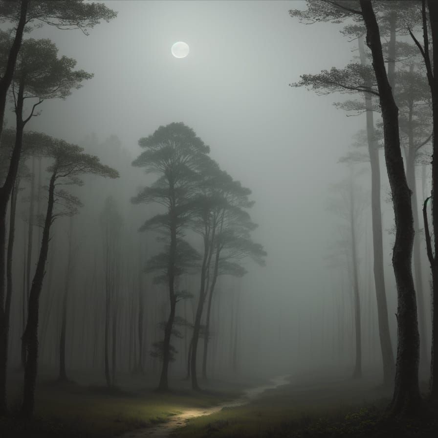 This image depicts a moody, romantic forest scene illuminated by moonlight through mist, rendered in an atmospheric painterly style.