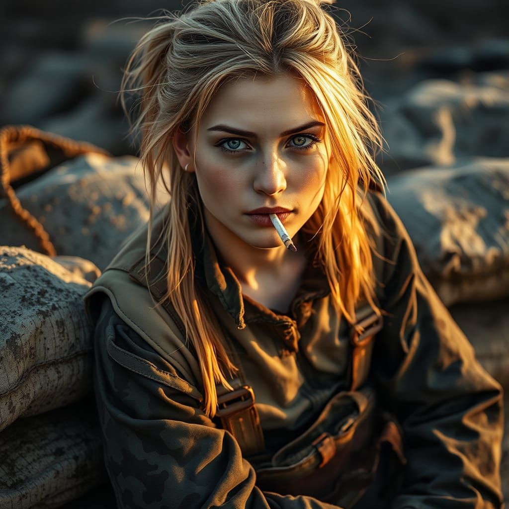 This image shows a young, battle-weary Ukrainian female soldier in a gritty, war-torn landscape, with a rugged texture and muted colors, evoking a sense of somber realism, amidst a warm, golden light with triadic colors, reminiscent of cinematic lighting.