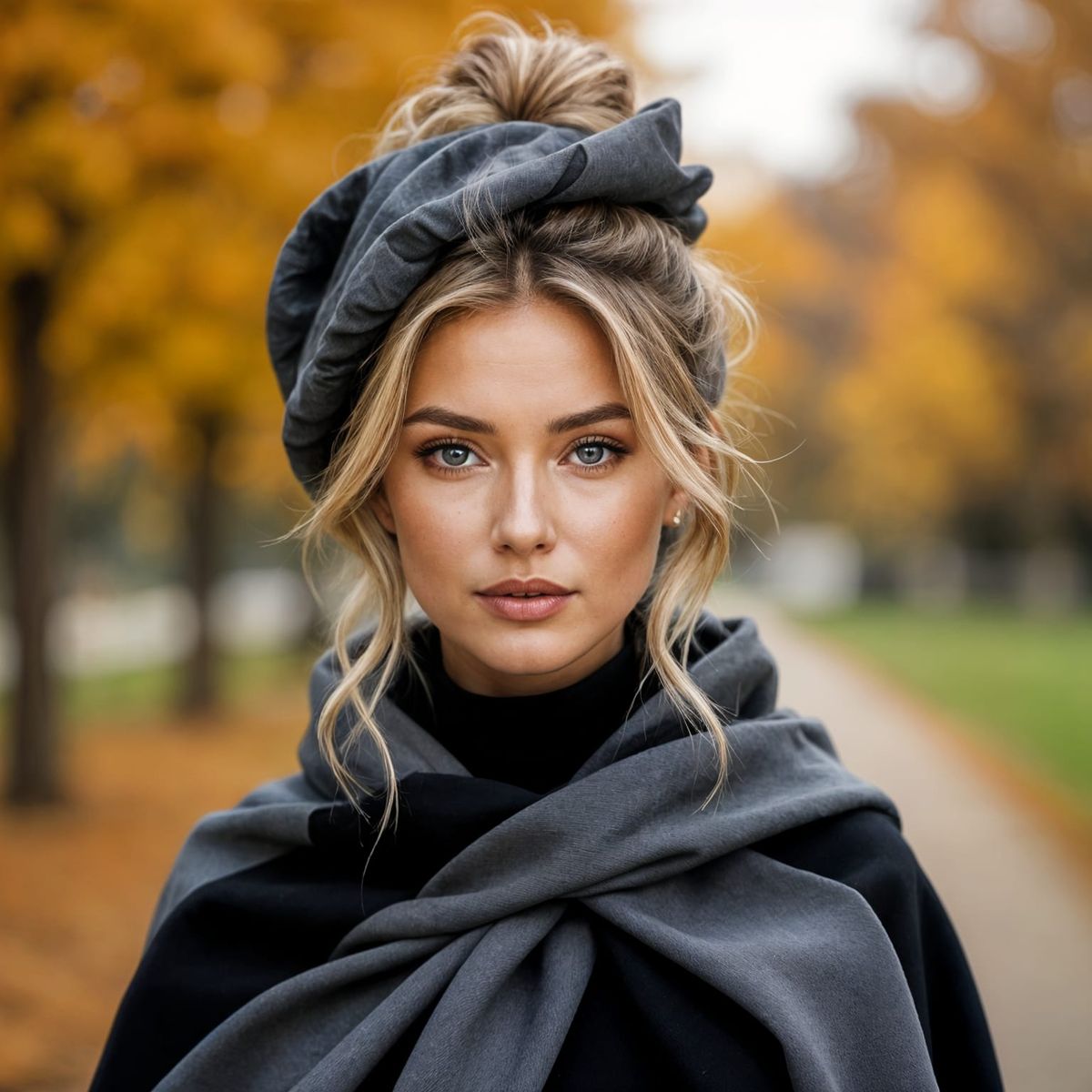 This AI-generated image features a young blonde woman with dark eyes and fair skin, wearing a gray and black cloak and a unique textured hat. She poses with a bold expression in an autumn setting.