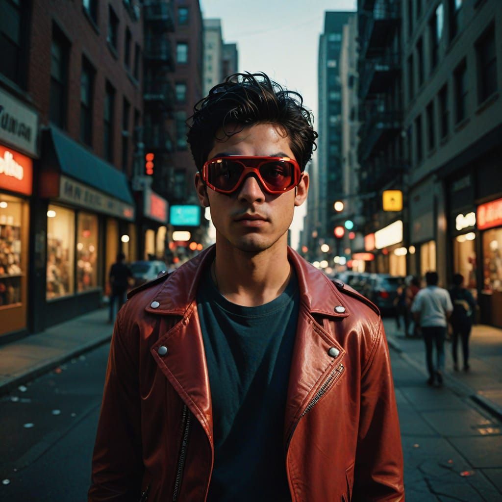 A close-up shot of a young American college student superhero, captured in vibrant cinematic style with a warm color scheme and deep shadows. He wears a striking red leather jacket and has glossy black hair, set against a dramatic 35mm film backdrop.