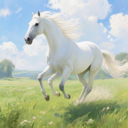 This image shows majestic white horses galloping freely in a lush green meadow under a bright sunny sky. Impressionistic influences are visible in the digital artwork.