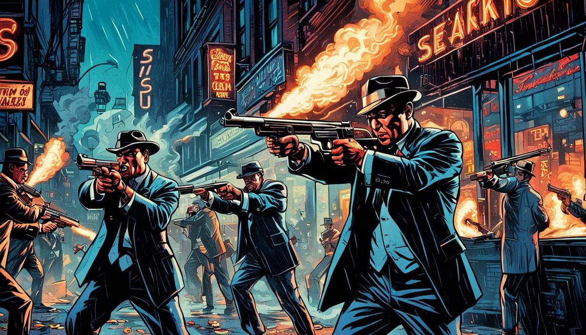 This image shows a dynamic scene of mobsters in Chicago firing Tommy guns outside of a speakeasy. The artwork features vivid colors, dynamic lighting, and high contrast, reminiscent of comic book art.