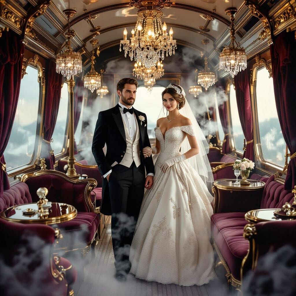 A captivating image of a wealthy couple inside their ornate airship. This dreamlike artwork features soft, golden lighting and luxurious details, reminiscent of a Thomas Kinkade painting.