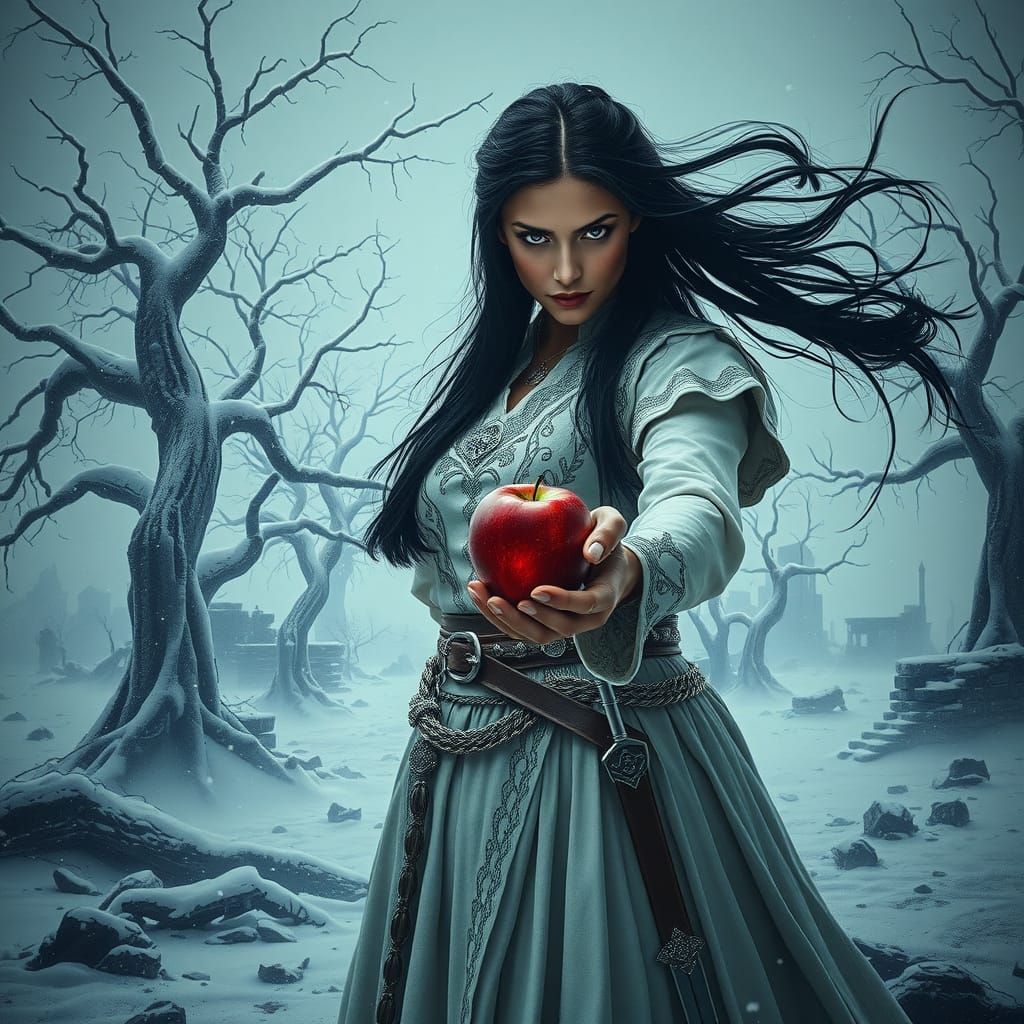 A striking picture of a tall woman warrior offering a red apple. She wears a detailed white medieval dress and emanates a menacing presence in a desolate, post-apocalyptic winter setting with heavy snowfall, rendered with sharp focus.