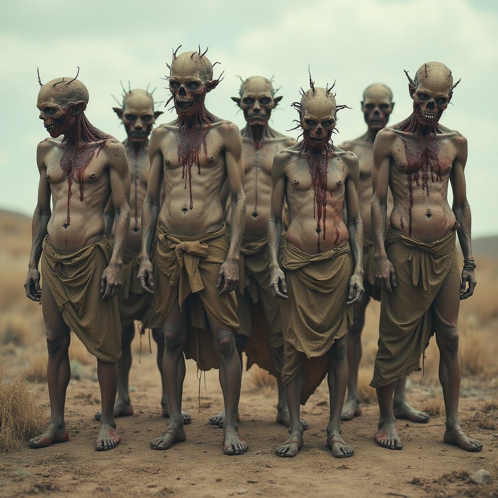 This image depicts a group of people in a post-apocalyptic setting, their bodies horrifically disfigured. The scene evokes dark organic forms and a surreal, unsettling aesthetic, rendered as futuristic and dystopian art.