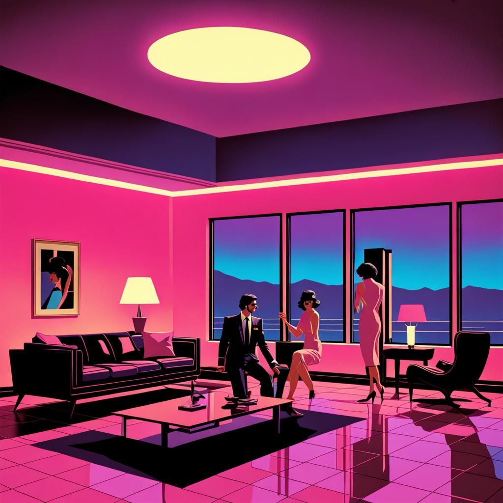 A luxurious 1970s house interior bathed in synthwave neon light. The image evokes a retro aesthetic.
