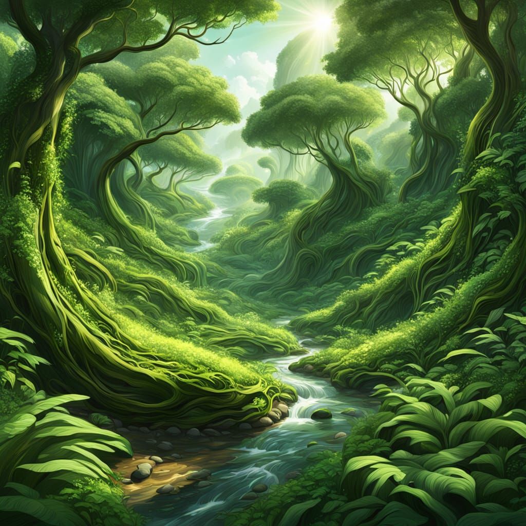 This image showcases a breathtaking, verdant landscape characterized by organic, flowing lines and lush green hues. Sunlight filters through dense foliage, creating a serene and detailed natural scene.